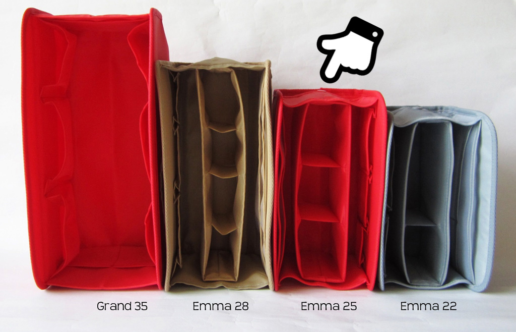 Emma 25 es un organizador interior para carteras mediano que se encuentra entre Emma 28 y 22. A continuación se muestran las dimensiones de Emma 25, que son 9.6”L x 5.9”H x 4.7”W (24.5 cm x 15 cm x 12 cm)